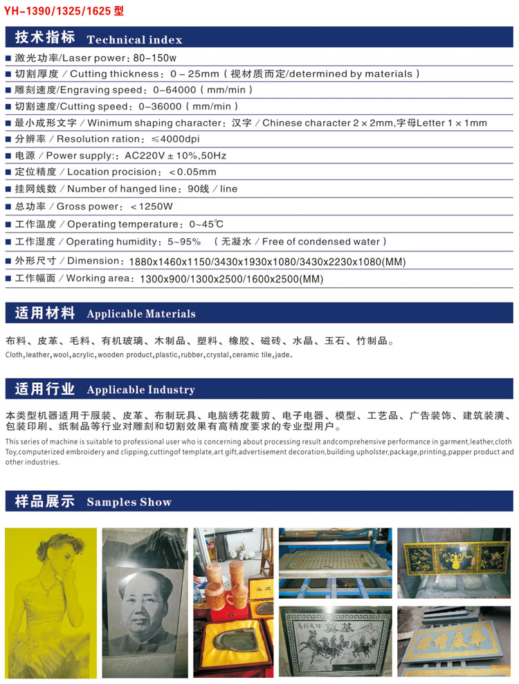 YH系列激光雕刻切割机应用于一些板材加工行业,如石材、玻璃、陶瓷、木材、有机玻璃等。较大板材的雕刻以及切割开料,采用特制的激光机床和机壳,使如石材般重达数吨的材质能安然处之,并不影响加工需要,为企业带来各种实质上的工艺解决方案。